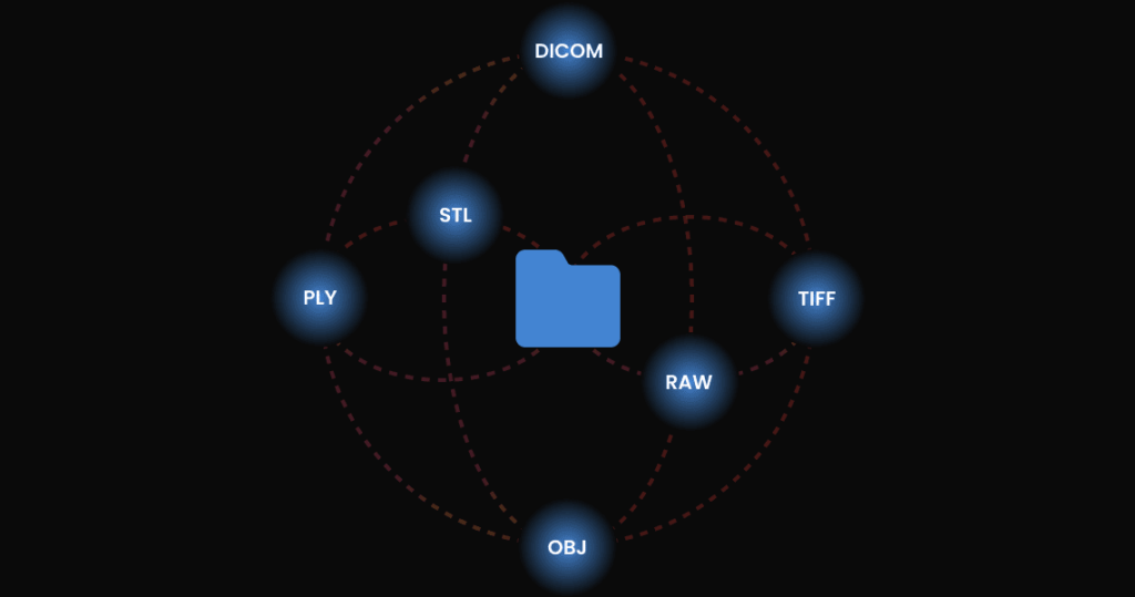 MeshInspector supports DICOM, RAW, TIFF, STL, OBJ, and PLY formats for dental data.
