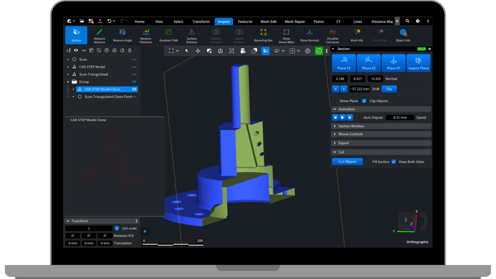 This update introduces in-plane rotation arrows for smoother navigation, smarter automatic memory splitting for heavy CUDA tasks, and precision controls for scaling and ratios. The redesigned Section tool lets you visually clip all objects, animate section movement, and enjoy a more compact UI. Plus, the Distance Compare tool now supports point cloud-to-mesh comparisons, and you can create new features by fitting them to an external triangle selection. We’ve also upgraded Boolean, Extrude, Section Fill, and Geodesic Path functionalities. Finally, DICOM handling just got better with support for secondary capture image storage types. Let’s dive in!