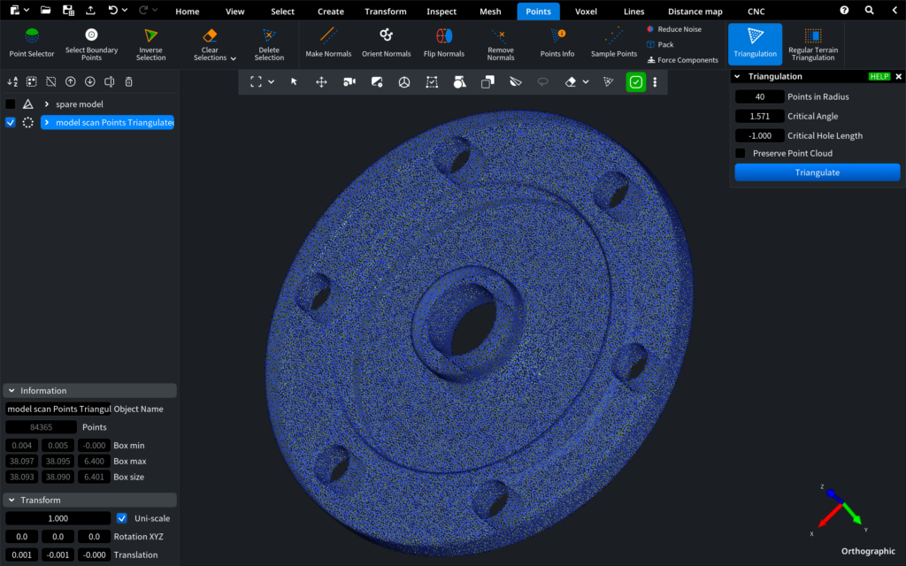 MeshInspector includes tools such as Noise Reduction, Outlier Removal, and Decimation (Sample Points) to ensure your scan data is clean and ready for accurate 3D modeling and inspection.