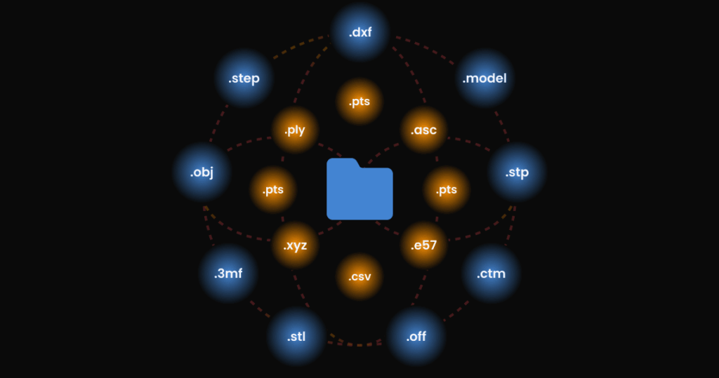 Point Cloud Formats: .ply, .pts, .asc, .csv, .xyz, .e57, .las, .laz
